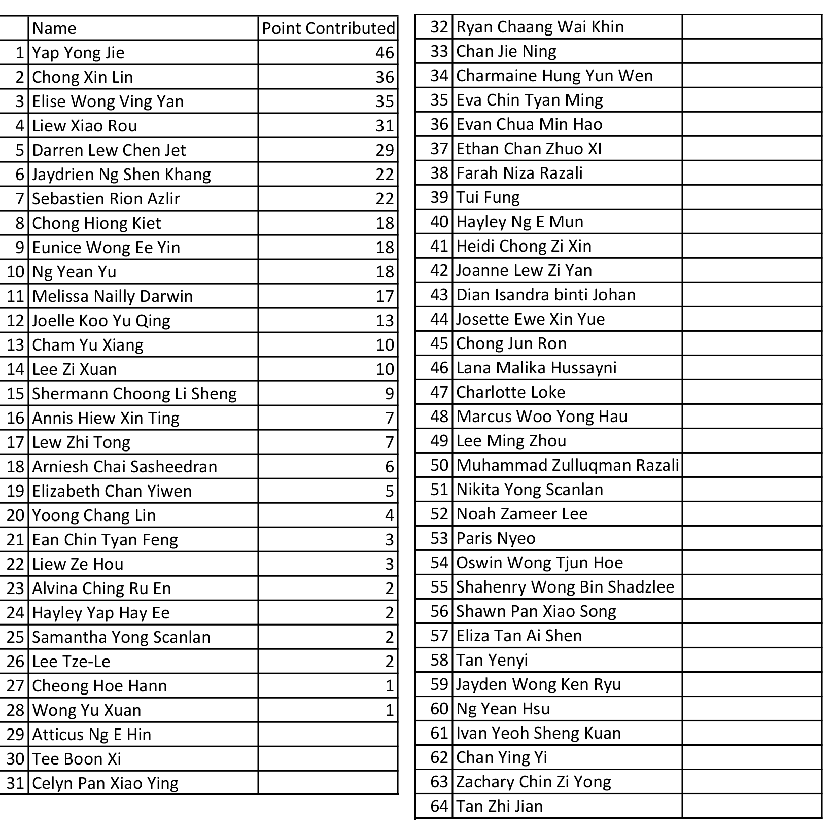 Apart from the podium finishes, DSA Swim Club also had a host of points contributed by swimmers whose valuable efforts made the Championship possible. These include Joelle Koo Yu Qing, Lee Zi Xuan, Annis Hiew Xin Ting, Arniesh Chai Sasheedran, Elizabeth Chan Yiwen, Yoong Chang Lin, Ean Chin Tyan Feng, Liew Ze Hou, Alvina Ching Ru En, Hayley Yap Hay Ee, Samantha Yong Scanlan, Lee Tze-Le, Cheong Hoe Hann and Wong Yu Xuan. The detailed list of the Medals tally, Points contribution and the Qualifiers are given below.