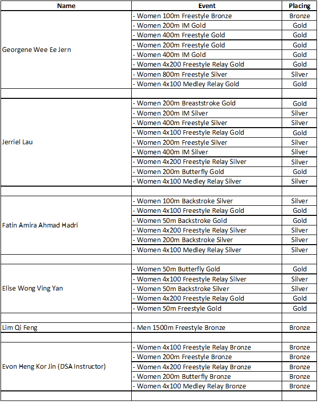 The swimmers of DSA Swimming Club who represented their own schools in the yearly national games included Georgene Wee Ee Jern, Jerriel Lau, Fatin Amira Ahmad Hadri, Elise Wong Ving Yan, Lim Qi Feng, John Lau Jin Kiat and Rowvan Ganesan. Besides these swimmers, DSA Instructor, Evon Heng Kor Jin also participated in the Games representing Universiti Putra Malaysia (UPM). The medal winners also included Jerriel Lau with 3 Golds, 6 Silvers, Fatin Amira Ahmad Hadri with 2 Golds, 4 Silvers, Elise Wong Ving Yan with 3 Golds, 2 Silvers, Evon Heng Kor Jin with 5 Bronzes and Lim Qi Feng with 1 Bronze at their events.