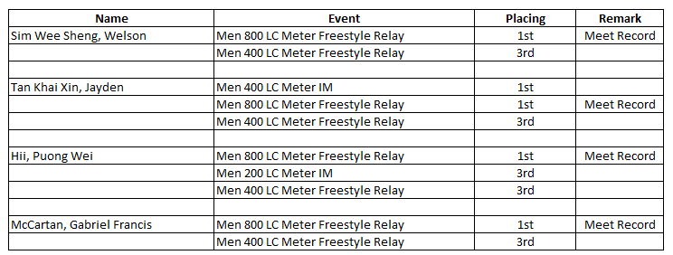 The DSA Relay quartet also took the Bronze in the Men’s 4x100m Freestyle Relay. Besides the Relay wins, Puong Wei brought home a Bronze in the Men’s 200m Individual Medley.
