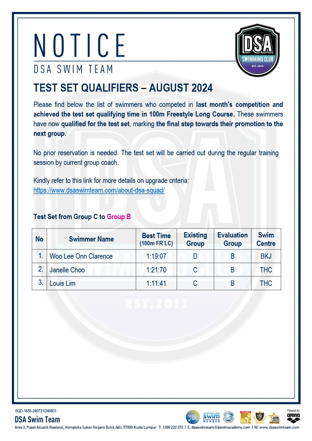 Test Set Qualifiers – October 2024 Promotion of Training Groups – October 2024 Test Set Qualifiers – September 2024 Promotion of Training Groups – September 2024 Test Set Qualifiers – August 2024 Test Set Qualifiers – August 2024 Post navigation ← Older posts Newer posts → SWIM MEETS & EVENTS 20262021-2025 20252024202320222021 Back 2016-2020 20202019201820172016 Back 2013-2015 201520142013 Back Back UPDATES NOTICE-BOARDTEAM NEWS NEWS ARCHIVES Back GALLERY 20262021-2025 20252024202320222021 Back 2016-2020 20202019201820172016 Back 2013-2015 201520142013 Back Back Back HANDBOOK/APPLICATION SQUAD HANDBOOKDEFERMENT FORMPRIVATE STROKE CORRECTION FORMSWIM CENTRE SWITCH FORM Back ABOUT DSA DSA SWIM TEAM PATHWAYTRAINING CALENDARDSA SPORTSCARENEED-BASED SCHOLARSHIPSCONTACT Back