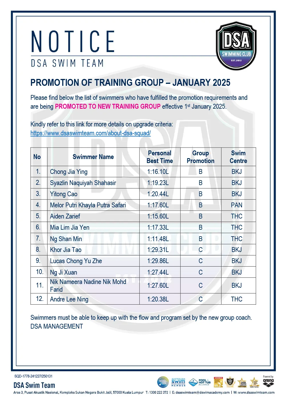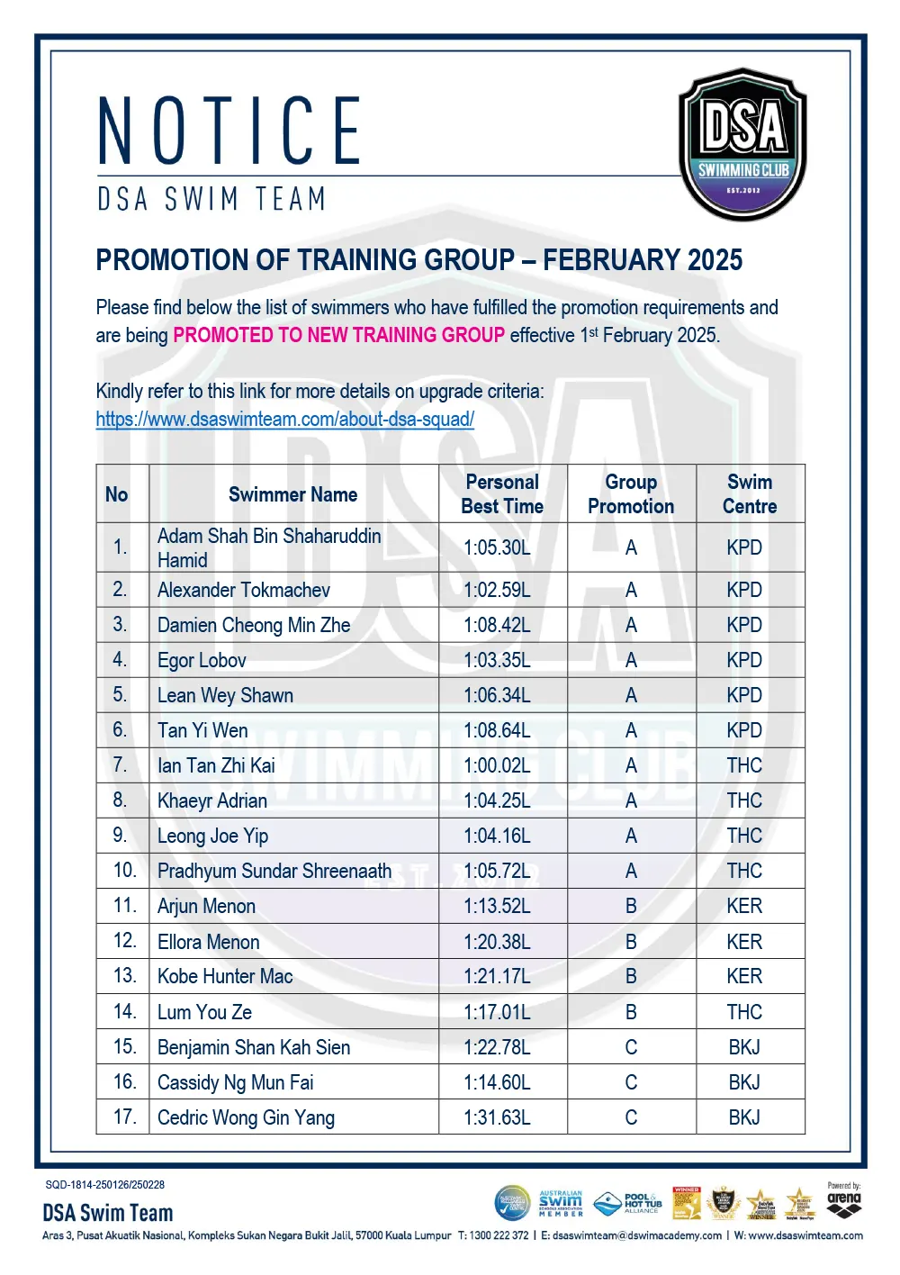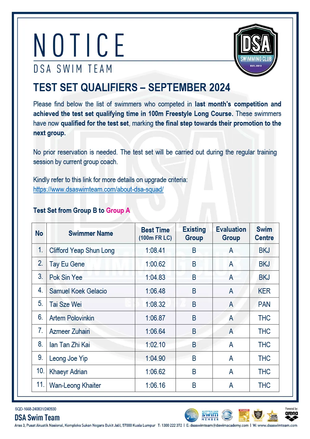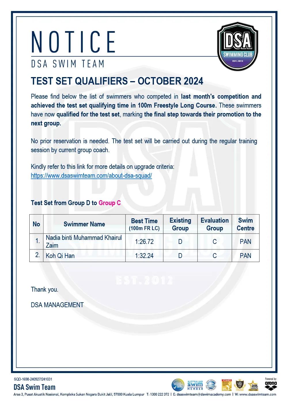 Promotion of Training Groups – January 2025 Promotion of Training Groups – January 2025 Test Set Qualifiers – October 2024 Promotion of Training Groups – October 2024 Test Set Qualifiers – September 2024 Promotion of Training Groups – September 2024 Test Set Qualifiers – August 2024 Test Set Qualifiers – August 2024 Post navigation ← Older posts Newer posts → SWIM MEETS & EVENTS 20262021-2025 20252024202320222021 Back 2016-2020 20202019201820172016 Back 2013-2015 201520142013 Back Back UPDATES NOTICE-BOARDTEAM NEWS NEWS ARCHIVES Back GALLERY 20262021-2025 20252024202320222021 Back 2016-2020 20202019201820172016 Back 2013-2015 201520142013 Back Back Back HANDBOOK/APPLICATION SQUAD HANDBOOKDEFERMENT FORMPRIVATE STROKE CORRECTION FORMSWIM CENTRE SWITCH FORM Back ABOUT DSA DSA SWIM TEAM PATHWAYTRAINING CALENDARDSA SPORTSCARENEED-BASED SCHOLARSHIPSCONTACT Back