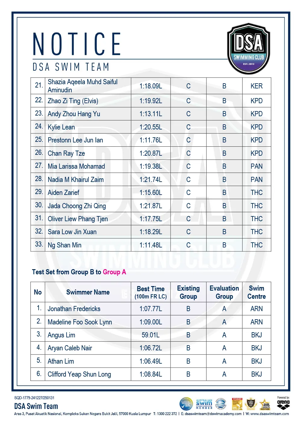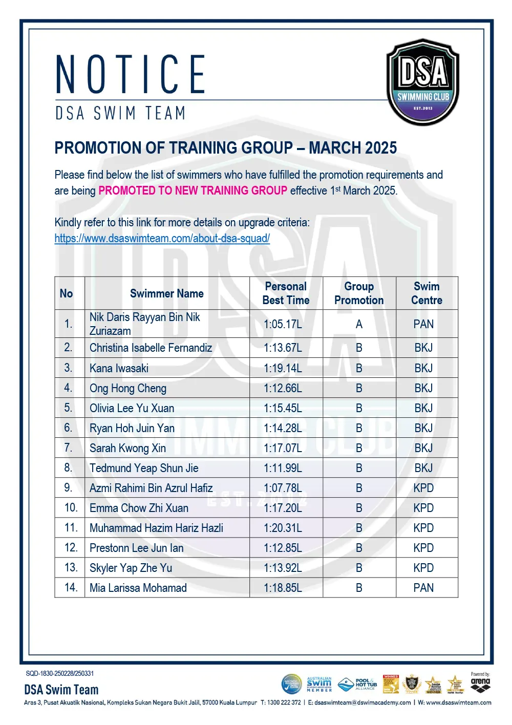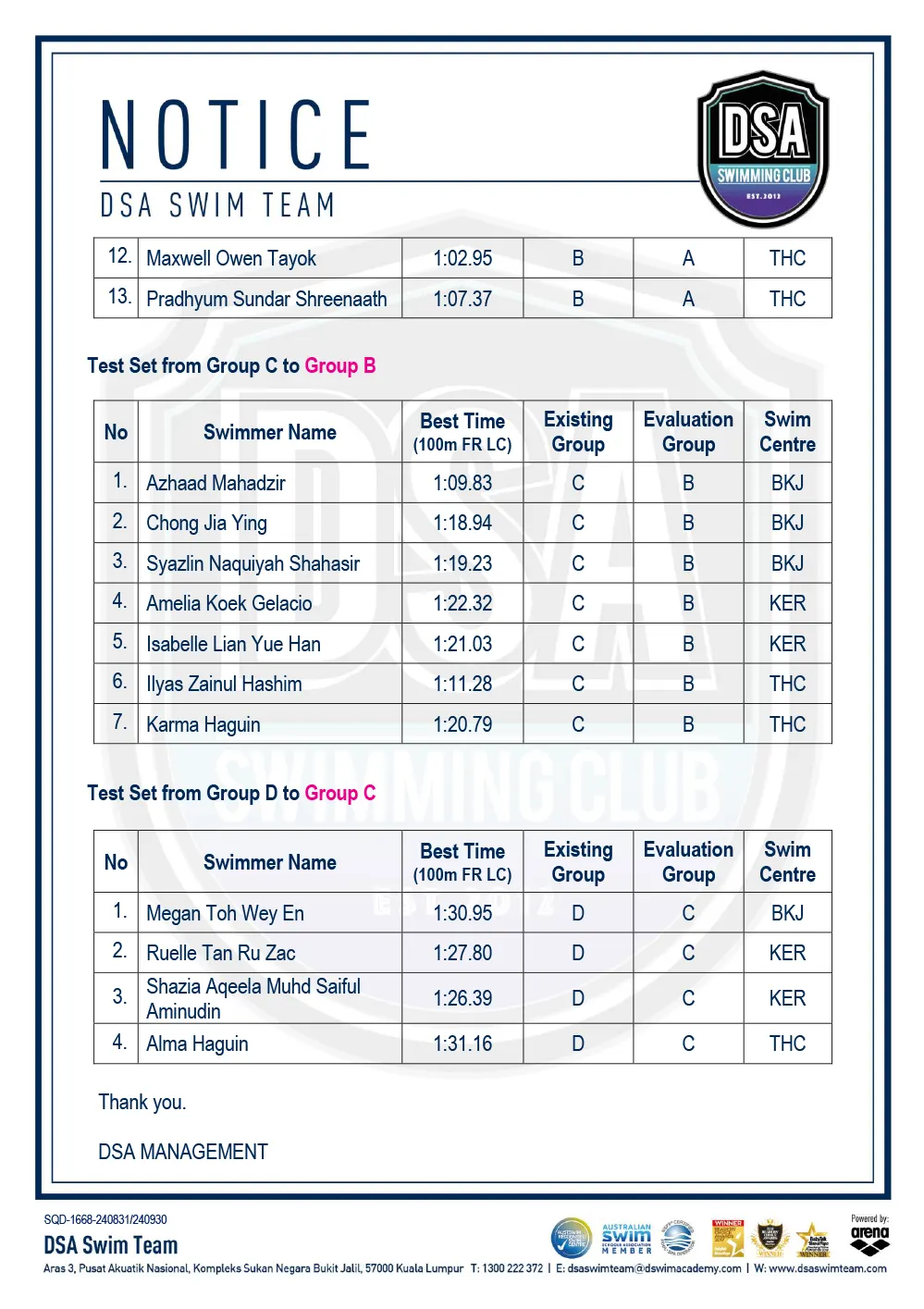 Promotion of Training Groups – January 2025 Promotion of Training Groups – January 2025 Test Set Qualifiers – October 2024 Promotion of Training Groups – October 2024 Test Set Qualifiers – September 2024 Promotion of Training Groups – September 2024 Test Set Qualifiers – August 2024 Test Set Qualifiers – August 2024 Post navigation ← Older posts Newer posts → SWIM MEETS & EVENTS 20262021-2025 20252024202320222021 Back 2016-2020 20202019201820172016 Back 2013-2015 201520142013 Back Back UPDATES NOTICE-BOARDTEAM NEWS NEWS ARCHIVES Back GALLERY 20262021-2025 20252024202320222021 Back 2016-2020 20202019201820172016 Back 2013-2015 201520142013 Back Back Back HANDBOOK/APPLICATION SQUAD HANDBOOKDEFERMENT FORMPRIVATE STROKE CORRECTION FORMSWIM CENTRE SWITCH FORM Back ABOUT DSA DSA SWIM TEAM PATHWAYTRAINING CALENDARDSA SPORTSCARENEED-BASED SCHOLARSHIPSCONTACT Back