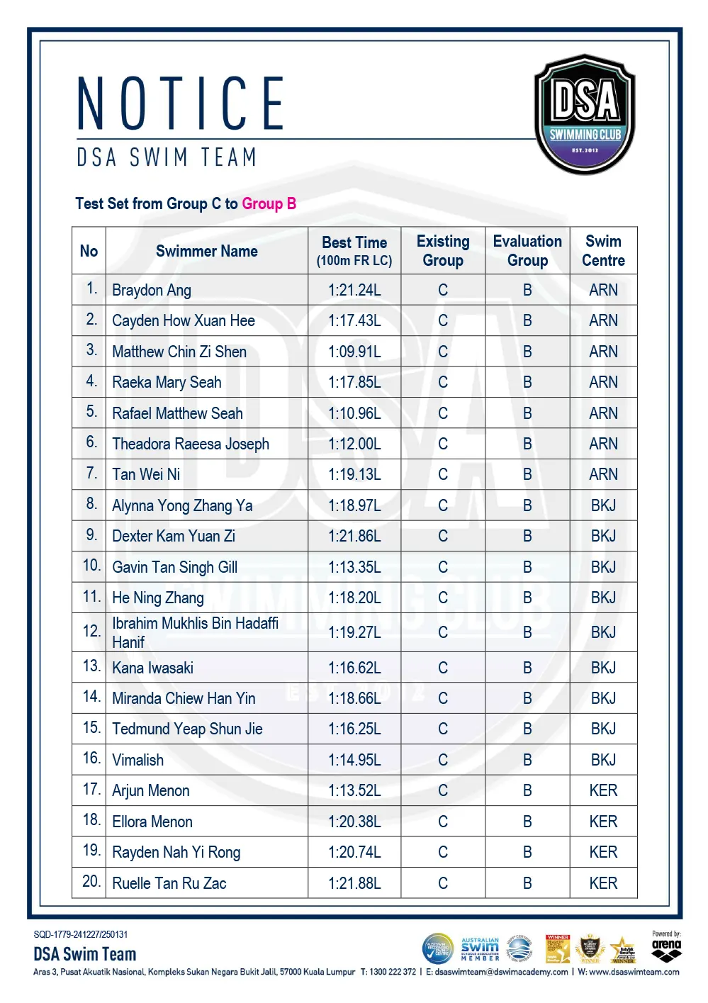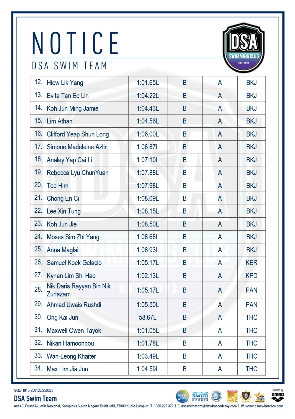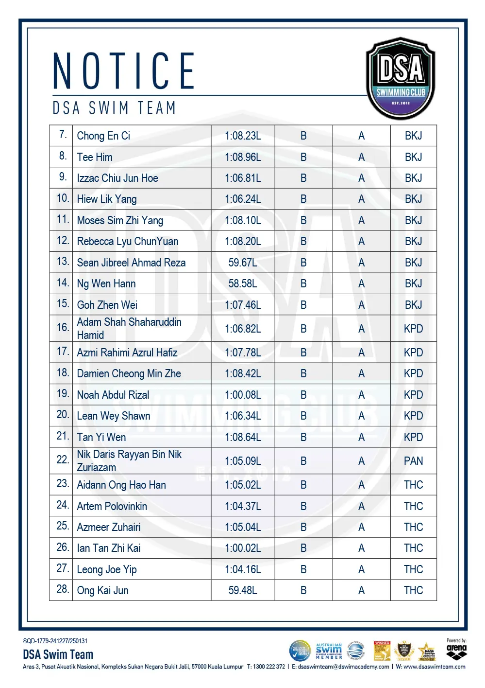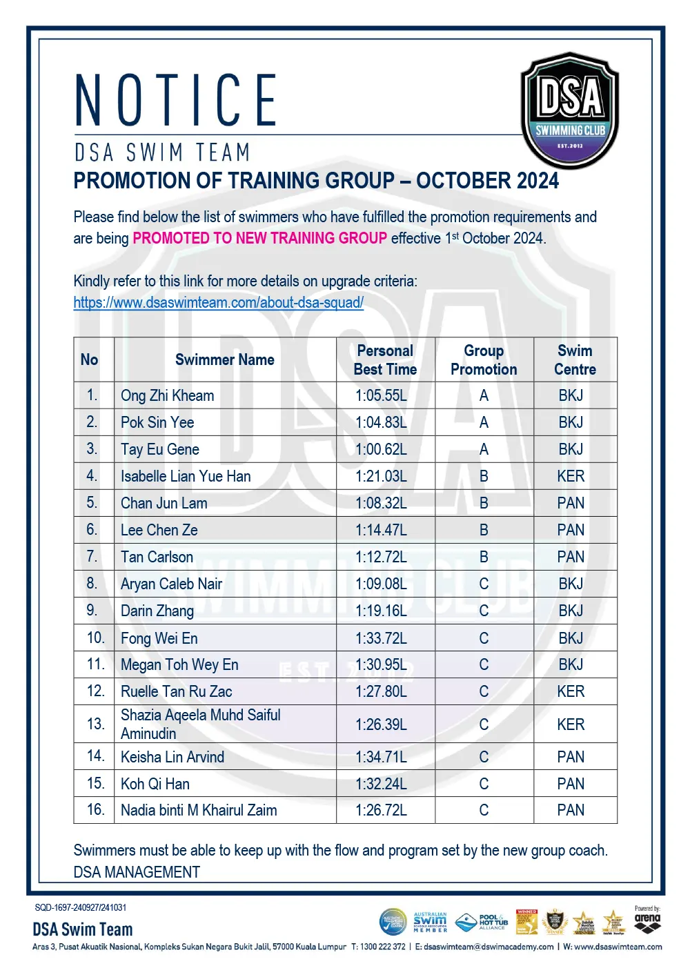 Promotion of Training Groups – January 2025 Promotion of Training Groups – January 2025 Test Set Qualifiers – October 2024 Promotion of Training Groups – October 2024 Test Set Qualifiers – September 2024 Promotion of Training Groups – September 2024 Test Set Qualifiers – August 2024 Test Set Qualifiers – August 2024 Post navigation ← Older posts Newer posts → SWIM MEETS & EVENTS 20262021-2025 20252024202320222021 Back 2016-2020 20202019201820172016 Back 2013-2015 201520142013 Back Back UPDATES NOTICE-BOARDTEAM NEWS NEWS ARCHIVES Back GALLERY 20262021-2025 20252024202320222021 Back 2016-2020 20202019201820172016 Back 2013-2015 201520142013 Back Back Back HANDBOOK/APPLICATION SQUAD HANDBOOKDEFERMENT FORMPRIVATE STROKE CORRECTION FORMSWIM CENTRE SWITCH FORM Back ABOUT DSA DSA SWIM TEAM PATHWAYTRAINING CALENDARDSA SPORTSCARENEED-BASED SCHOLARSHIPSCONTACT Back