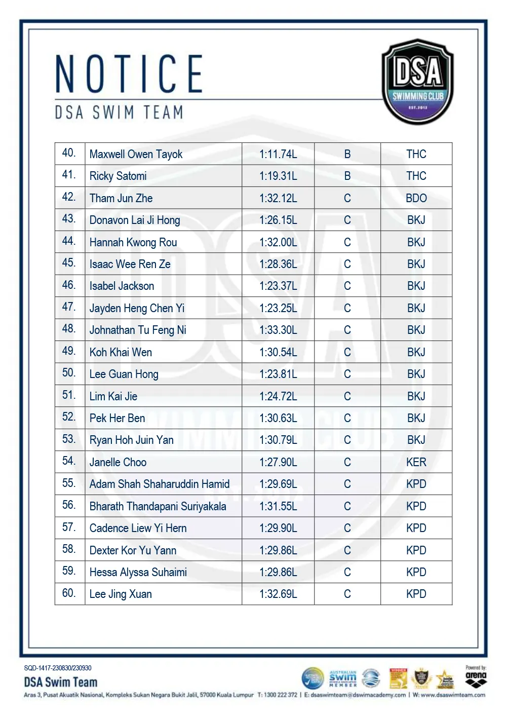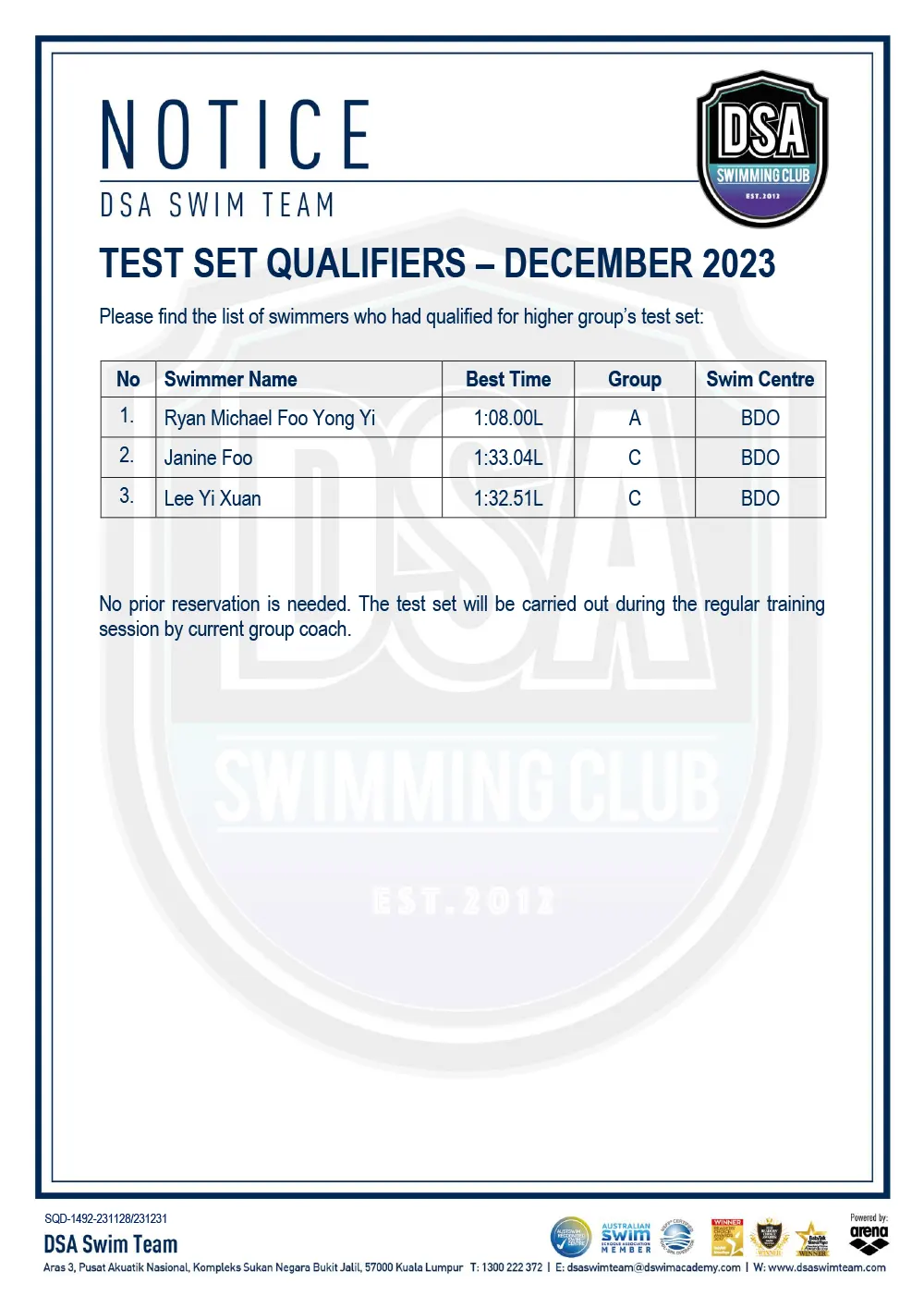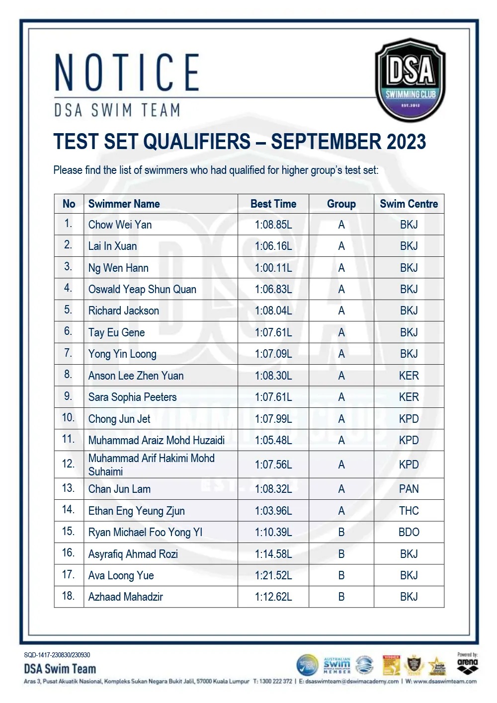 Test Set Qualifiers – December 2023 Promotion of Training Groups – December 2023 Promotion of Training Groups – November 2023 Test Set Qualifiers – November 2023 Squad Training- Arena Setapak Training Changes Test Set Qualifiers – September 2023 Promotion of Training Groups – September 2023 Test Set Qualifiers – August 2023 Promotion of Training Groups – August 2023 Squad Training Change – Junior Splash Leg-2 Post navigation ← Older posts Newer posts → SWIM MEETS & EVENTS 20262021-2025 20252024202320222021 Back 2016-2020 20202019201820172016 Back 2013-2015 201520142013 Back Back UPDATES NOTICE-BOARDTEAM NEWS NEWS ARCHIVES Back GALLERY 20262021-2025 20252024202320222021 Back 2016-2020 20202019201820172016 Back 2013-2015 201520142013 Back Back Back HANDBOOK/APPLICATION SQUAD HANDBOOKDEFERMENT FORMPRIVATE STROKE CORRECTION FORMSWIM CENTRE SWITCH FORM Back ABOUT DSA DSA SWIM TEAM PATHWAYTRAINING CALENDARDSA SPORTSCARENEED-BASED SCHOLARSHIPSCONTACT Back
