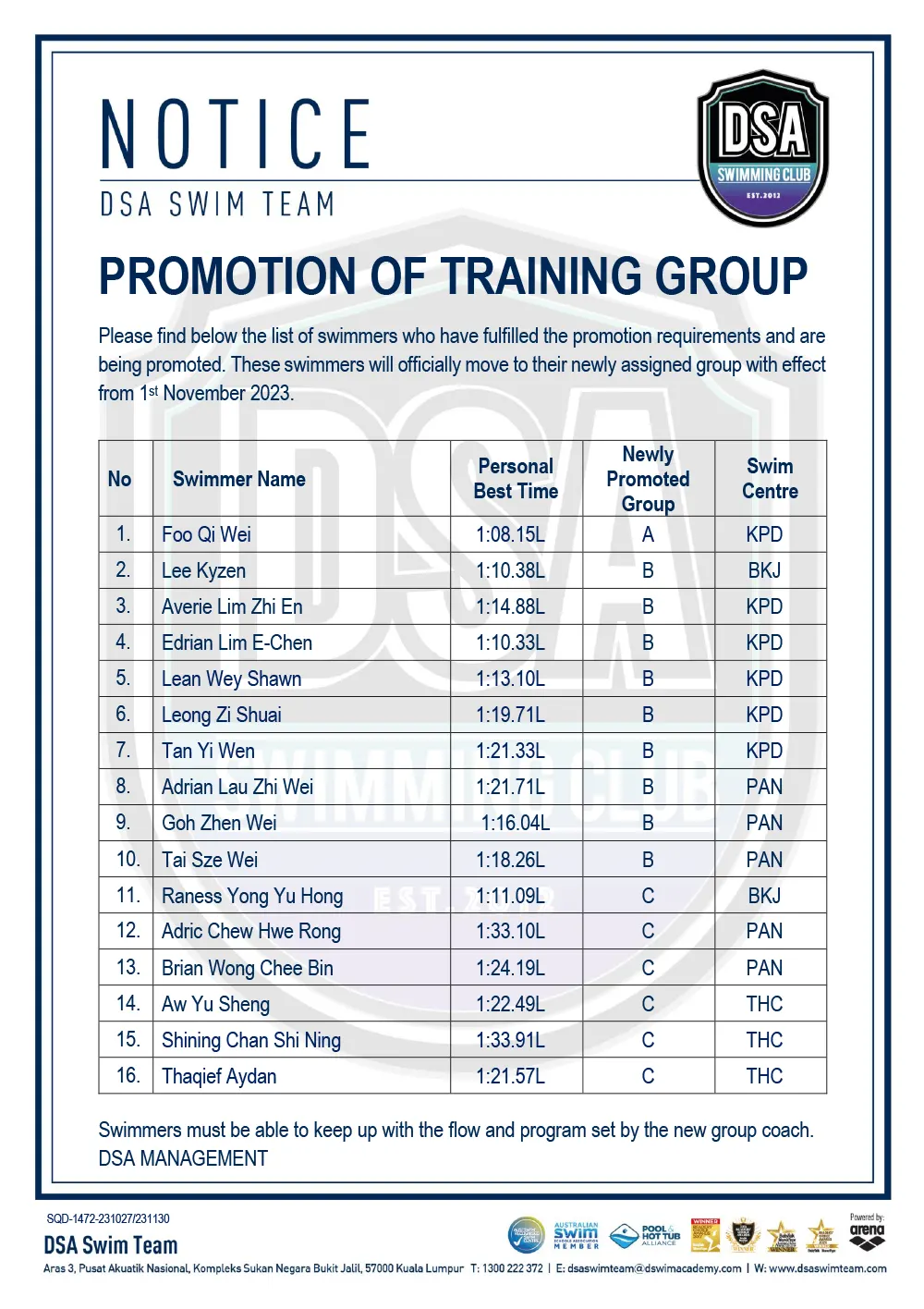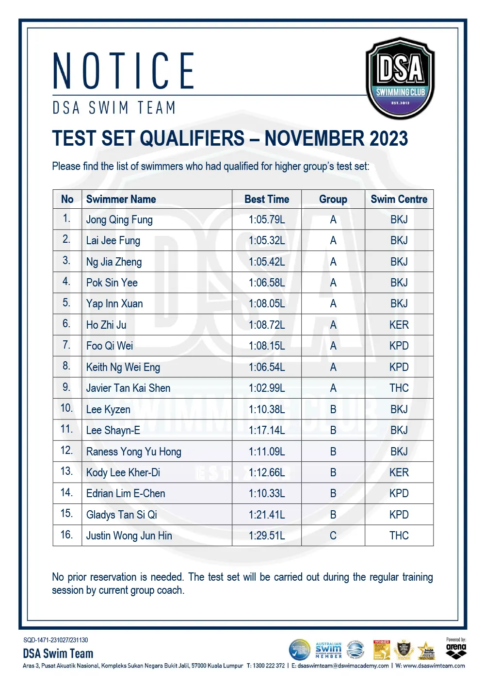 Promotion of Training Groups – November 2023 Test Set Qualifiers – November 2023 Squad Training- Arena Setapak Training Changes Test Set Qualifiers – September 2023 Promotion of Training Groups – September 2023 Test Set Qualifiers – August 2023 Promotion of Training Groups – August 2023 Squad Training Change – Junior Splash Leg-2 Post navigation ← Older posts Newer posts → SWIM MEETS & EVENTS 20262021-2025 20252024202320222021 Back 2016-2020 20202019201820172016 Back 2013-2015 201520142013 Back Back UPDATES NOTICE-BOARDTEAM NEWS NEWS ARCHIVES Back GALLERY 20262021-2025 20252024202320222021 Back 2016-2020 20202019201820172016 Back 2013-2015 201520142013 Back Back Back HANDBOOK/APPLICATION SQUAD HANDBOOKDEFERMENT FORMPRIVATE STROKE CORRECTION FORMSWIM CENTRE SWITCH FORM Back ABOUT DSA DSA SWIM TEAM PATHWAYTRAINING CALENDARDSA SPORTSCARENEED-BASED SCHOLARSHIPSCONTACT Back