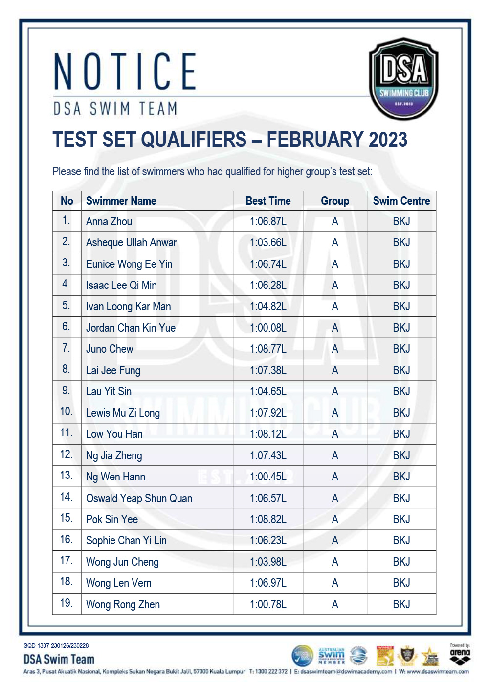 Promotion of Training Group – February 2023 Test Set Qualifiers – February 2023 Promotion of Training Groups – January 2023 Test Set Qualifiers – January 2023 Promotion of Training Groups – December 2022 Promotion of Training Groups – November 2022 Test Set Qualifiers – November 2022 Promotion of Training Groups – October 2022 Post navigation ← Older posts Newer posts → SWIM MEETS & EVENTS 20262021-2025 20252024202320222021 Back 2016-2020 20202019201820172016 Back 2013-2015 201520142013 Back Back UPDATES NOTICE-BOARDTEAM NEWS NEWS ARCHIVES Back GALLERY 20262021-2025 20252024202320222021 Back 2016-2020 20202019201820172016 Back 2013-2015 201520142013 Back Back Back HANDBOOK/APPLICATION SQUAD HANDBOOKDEFERMENT FORMPRIVATE STROKE CORRECTION FORMSWIM CENTRE SWITCH FORM Back ABOUT DSA DSA SWIM TEAM PATHWAYTRAINING CALENDARDSA SPORTSCARENEED-BASED SCHOLARSHIPSCONTACT Back