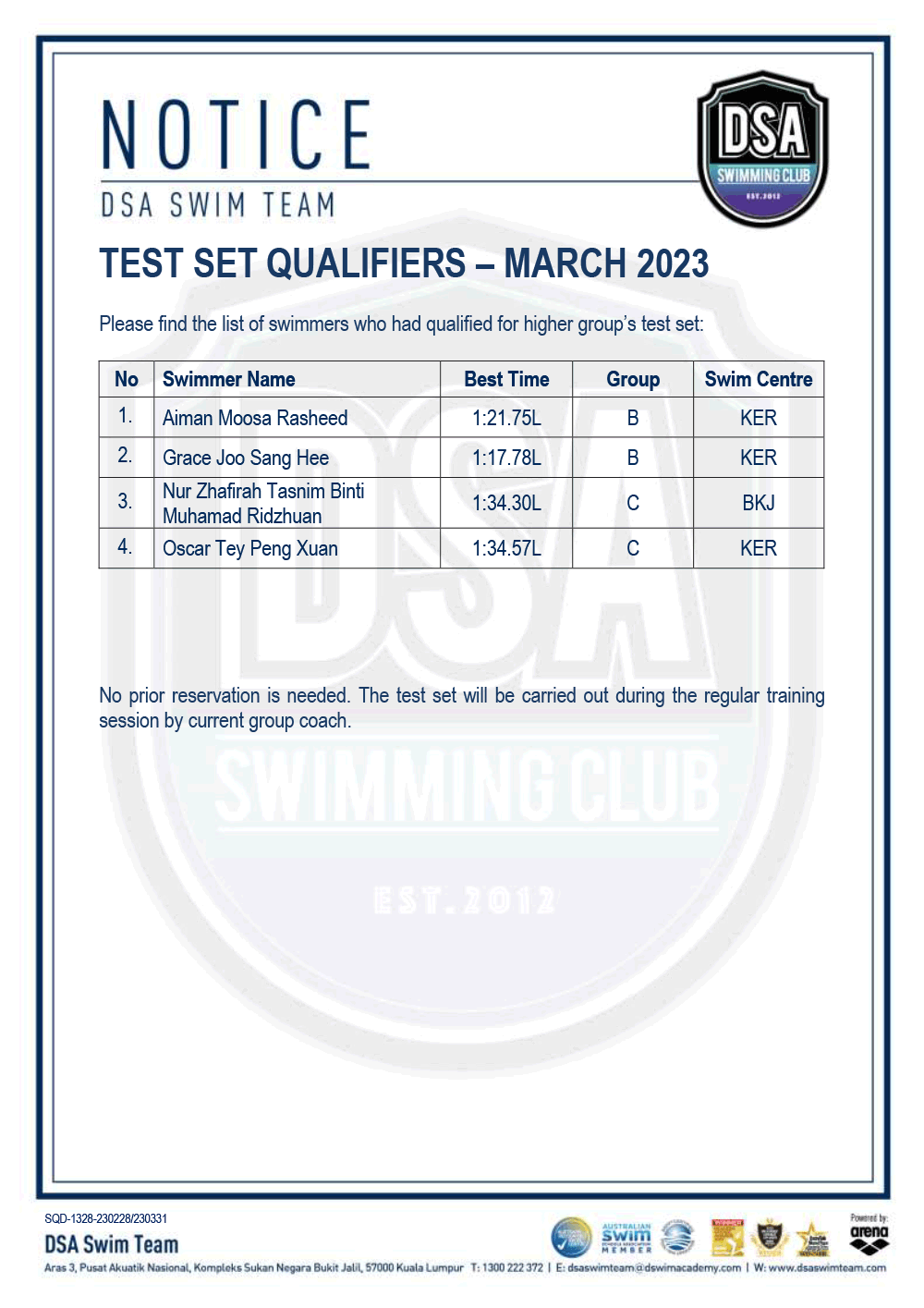 Promotion of Training Groups – March 2023 Test Set Qualifiers – March 2023 Promotion of Training Group – February 2023 Test Set Qualifiers – February 2023 Promotion of Training Groups – January 2023 Test Set Qualifiers – January 2023 Promotion of Training Groups – December 2022 Promotion of Training Groups – November 2022 Test Set Qualifiers – November 2022 Promotion of Training Groups – October 2022 Post navigation ← Older posts Newer posts → SWIM MEETS & EVENTS 20262021-2025 20252024202320222021 Back 2016-2020 20202019201820172016 Back 2013-2015 201520142013 Back Back UPDATES NOTICE-BOARDTEAM NEWS NEWS ARCHIVES Back GALLERY 20262021-2025 20252024202320222021 Back 2016-2020 20202019201820172016 Back 2013-2015 201520142013 Back Back Back HANDBOOK/APPLICATION SQUAD HANDBOOKDEFERMENT FORMPRIVATE STROKE CORRECTION FORMSWIM CENTRE SWITCH FORM Back ABOUT DSA DSA SWIM TEAM PATHWAYTRAINING CALENDARDSA SPORTSCARENEED-BASED SCHOLARSHIPSCONTACT Back