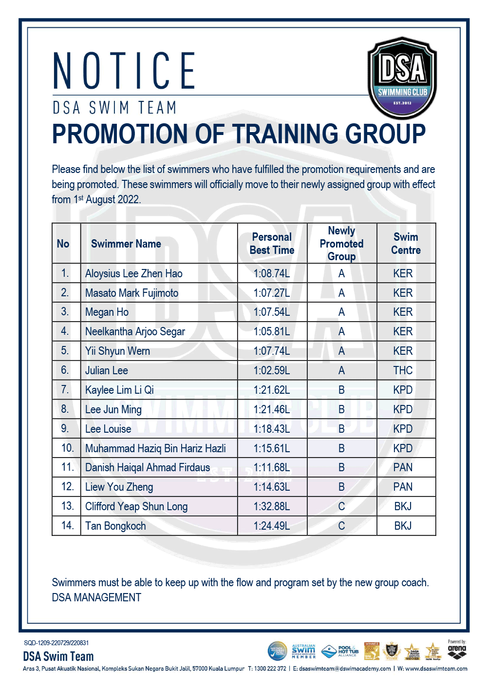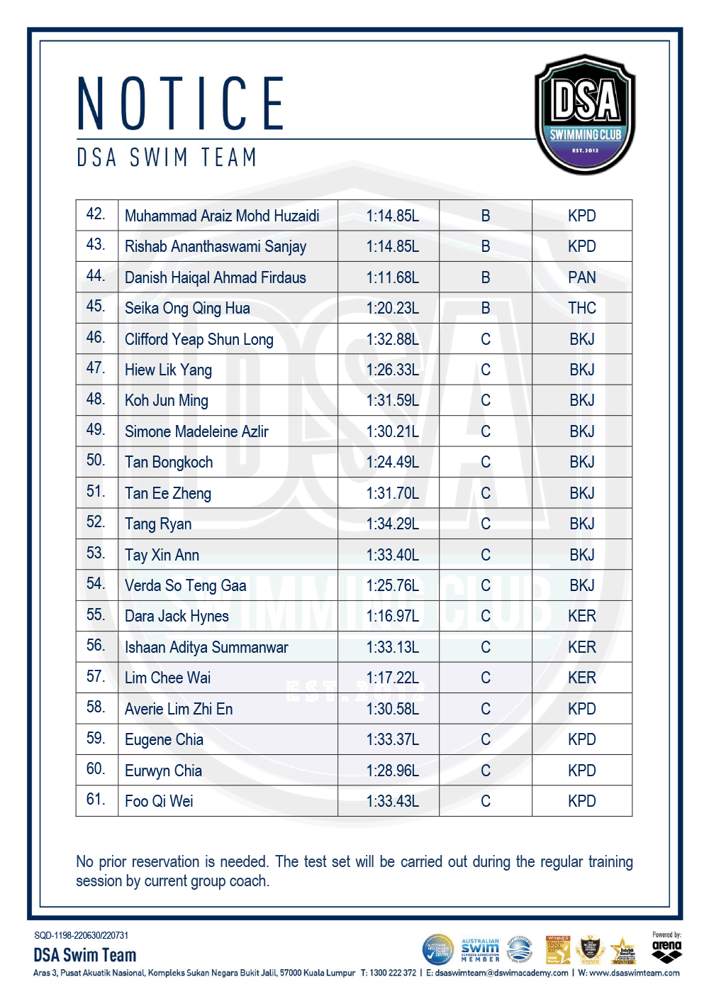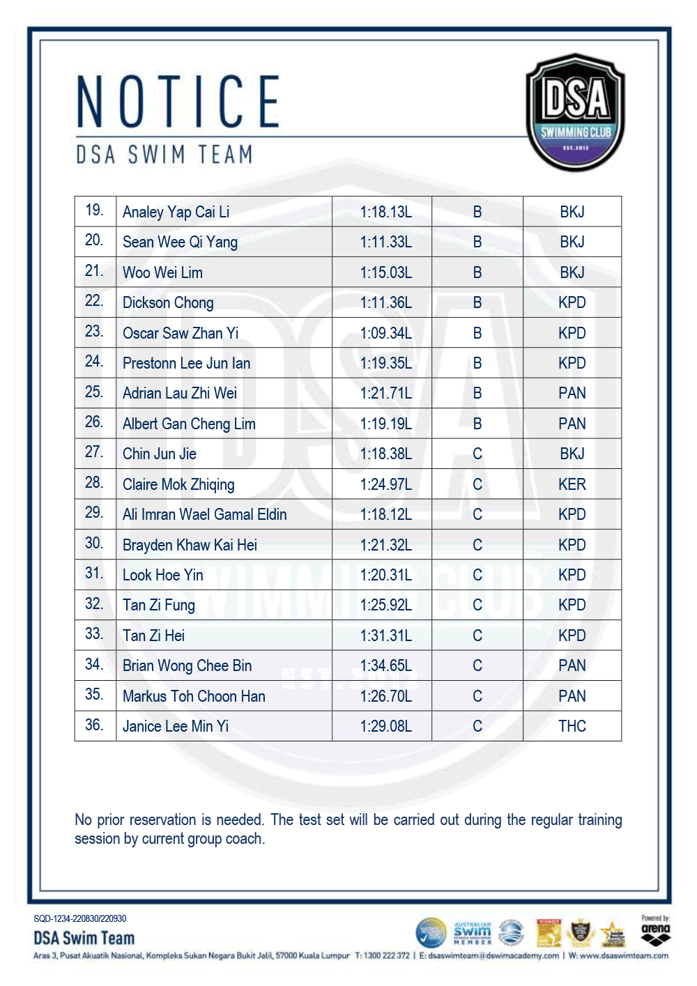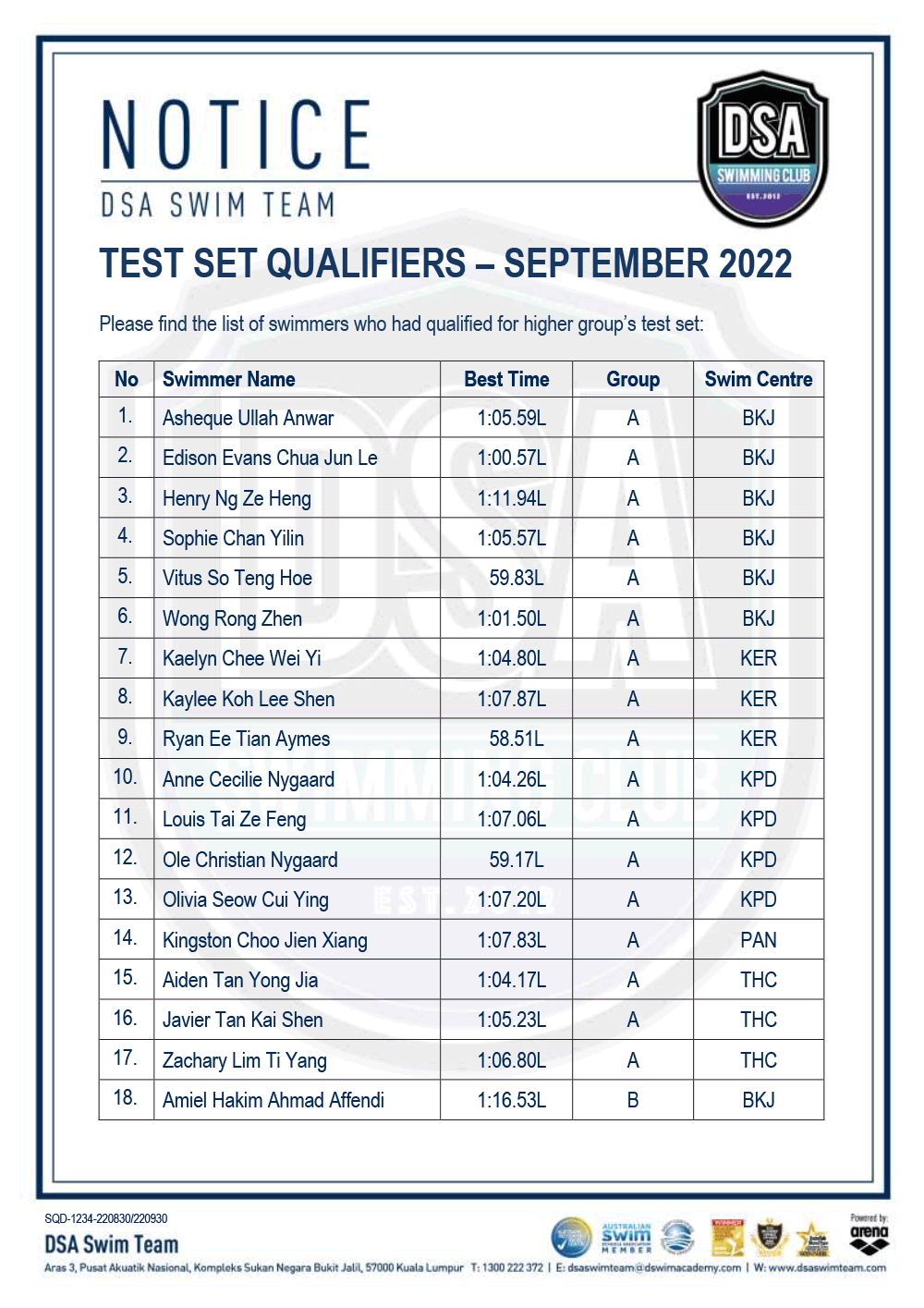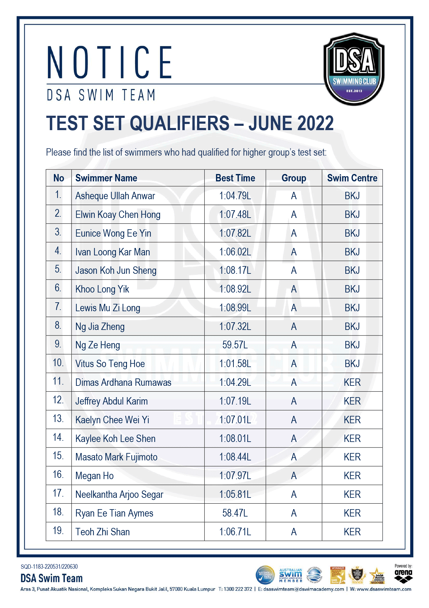 DSA Info Pack & SOP – Junior Splash Swim 2022 Bukit Jalil Squad Training Change – Amended Test Set Qualifiers – June 2022 Promotion of Training Groups – June 2022 Post navigation ← Older posts Newer posts →