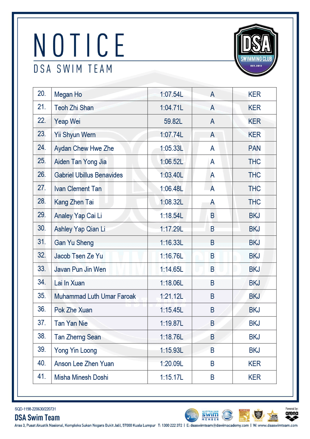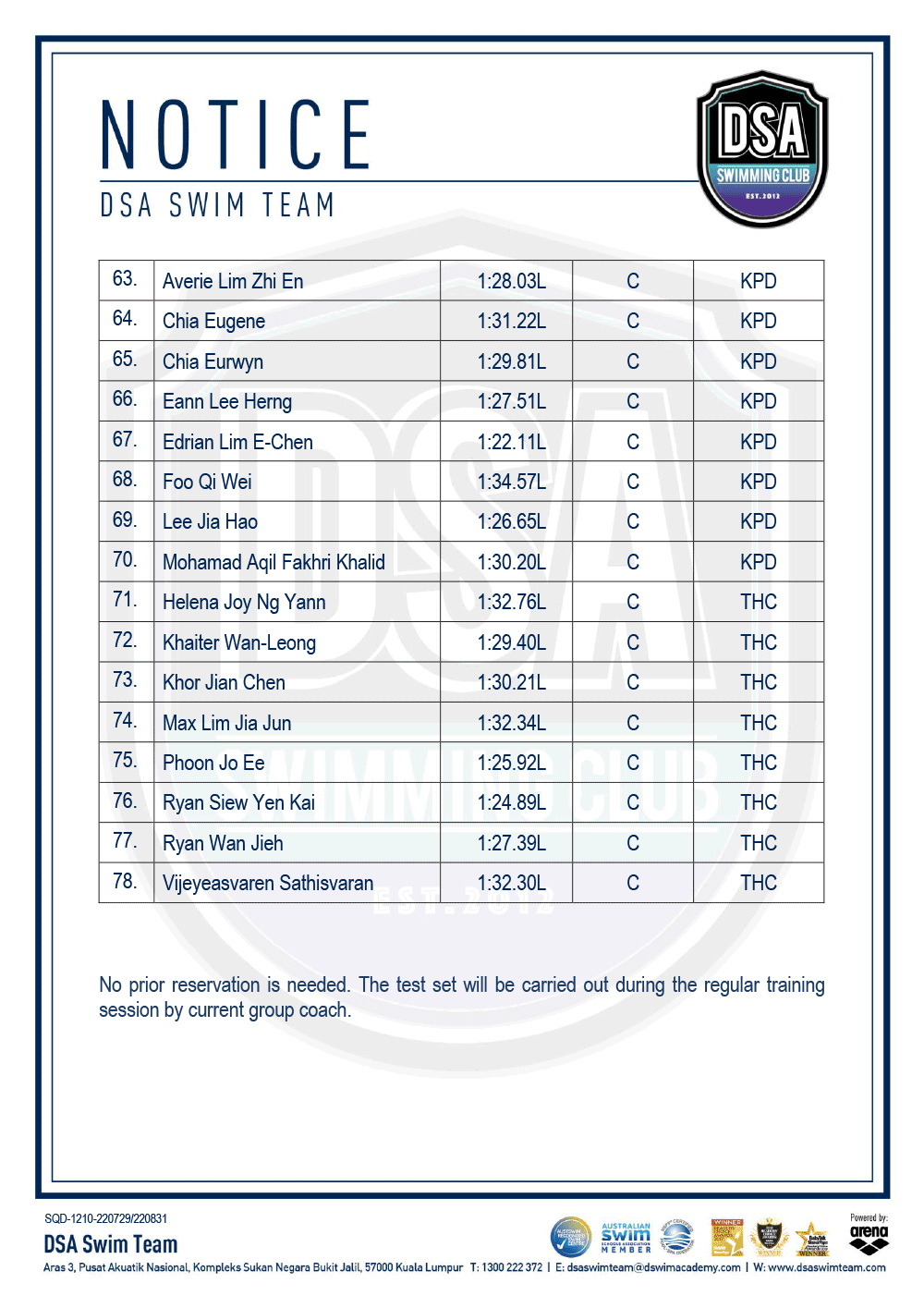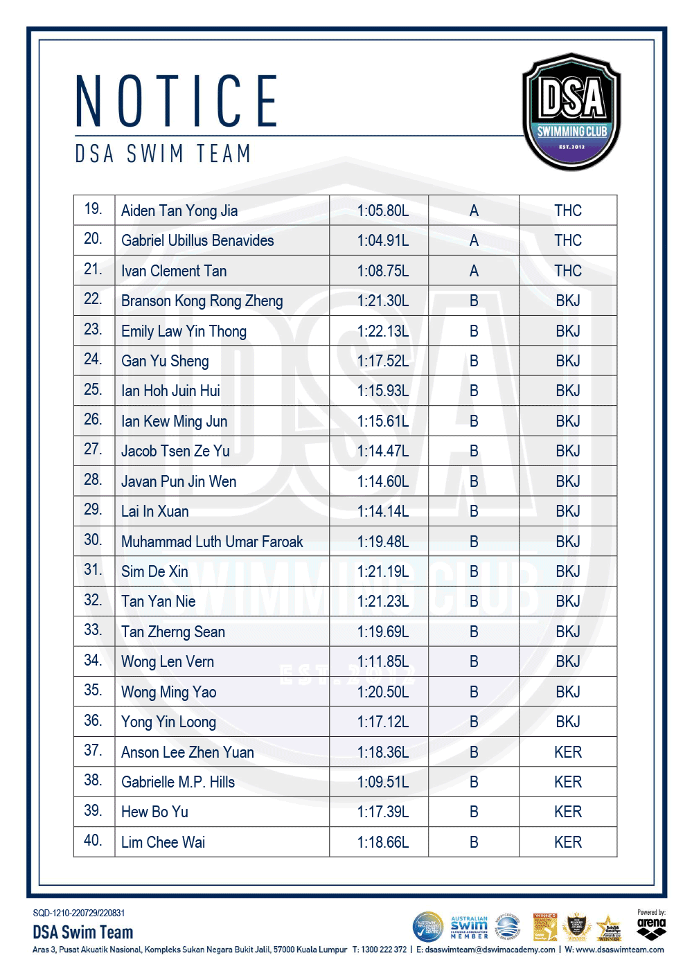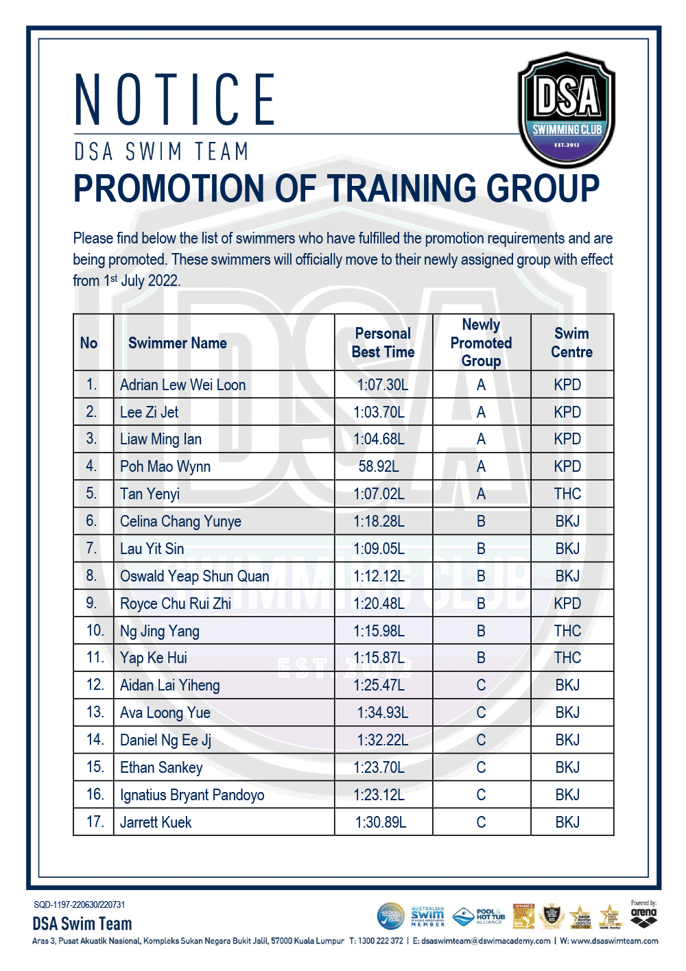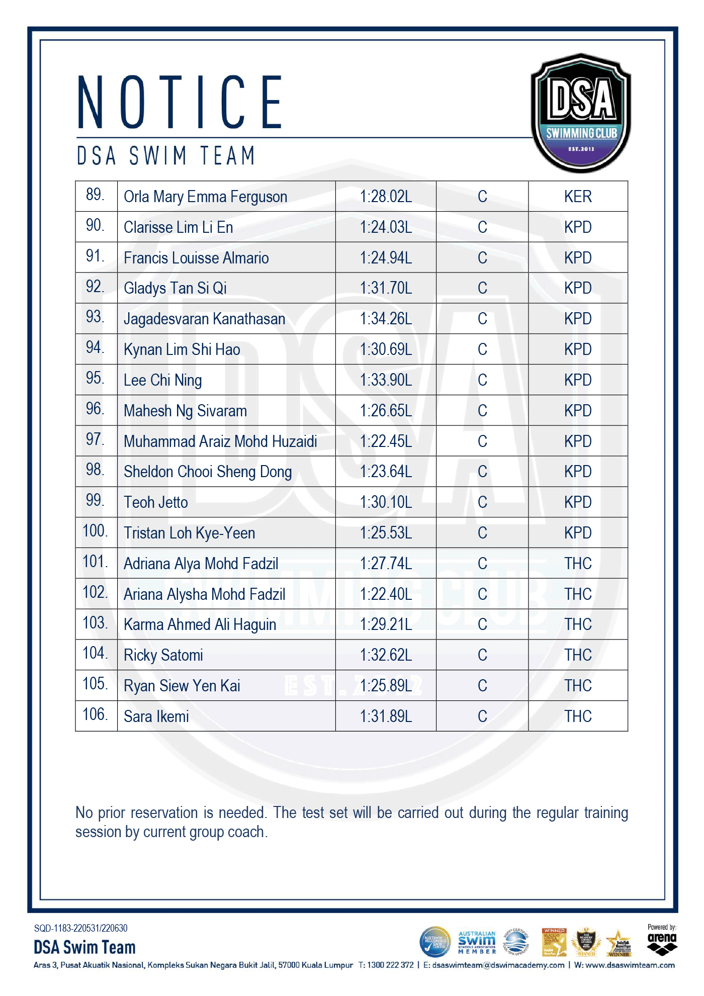 DSA Info Pack & SOP – Junior Splash Swim 2022 Bukit Jalil Squad Training Change – Amended Test Set Qualifiers – June 2022 Promotion of Training Groups – June 2022 Post navigation ← Older posts Newer posts →