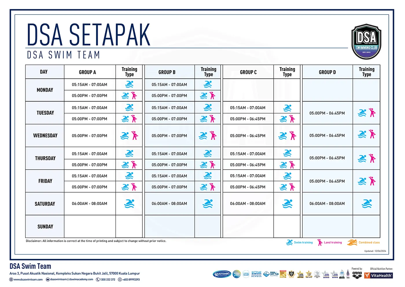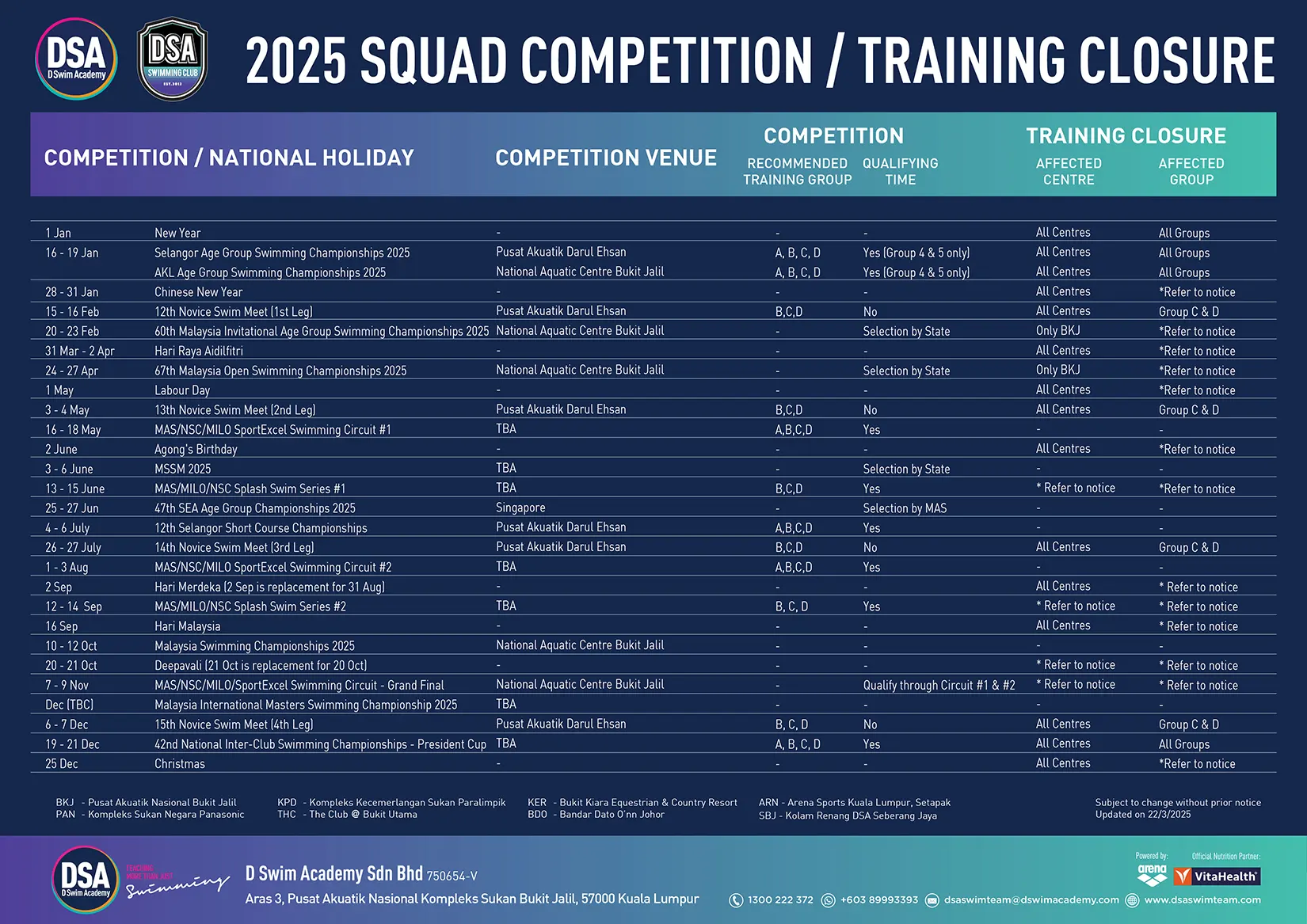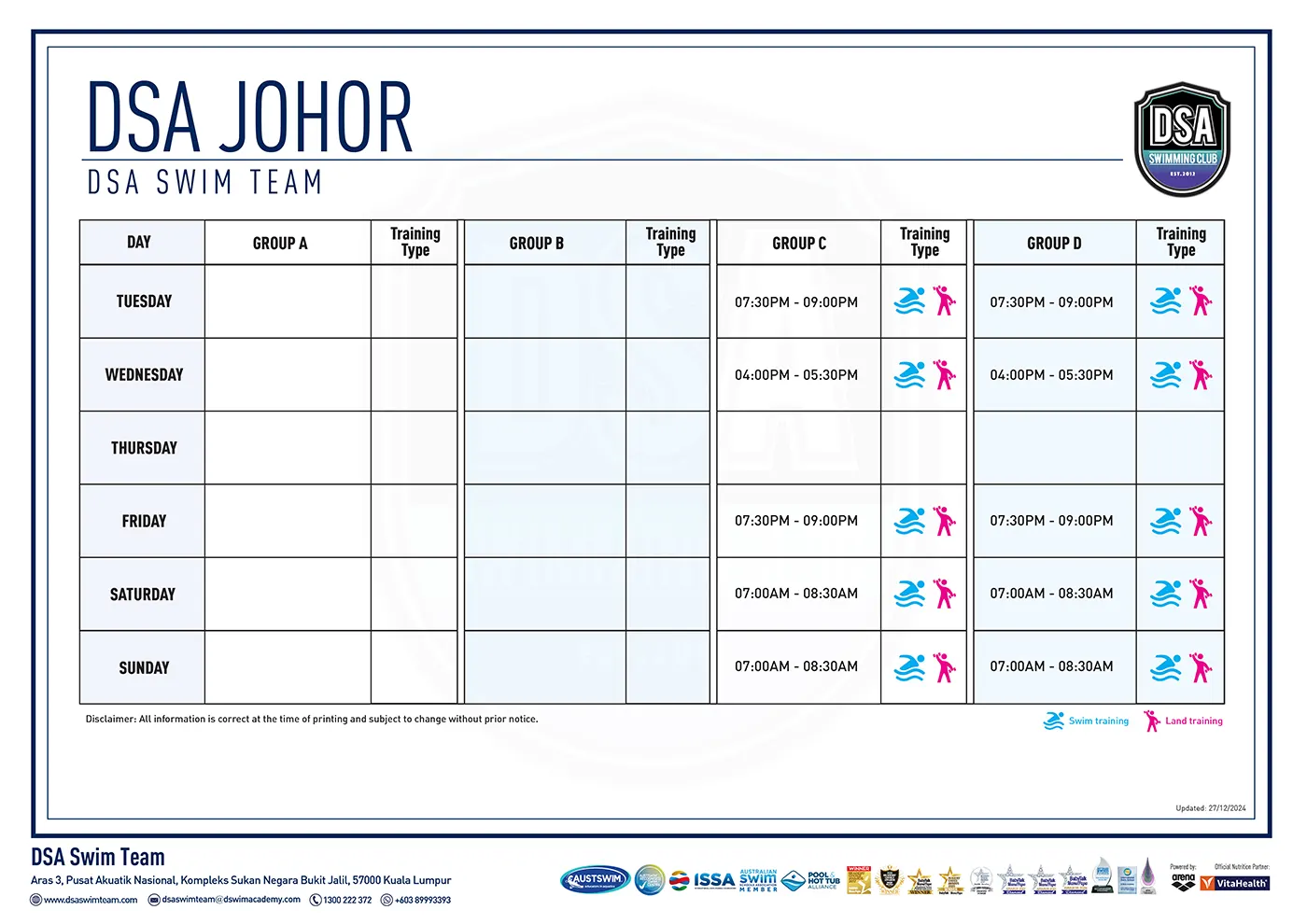 DSA TRAINING CALENDAR SQUAD TRAINING SCHEDULE BUKIT JALIL KG. PANDAN PANASONIC BUKIT UTAMA BUKIT KIARA BANDAR DATO' ONN ARENA KL SEBERANG JAYA