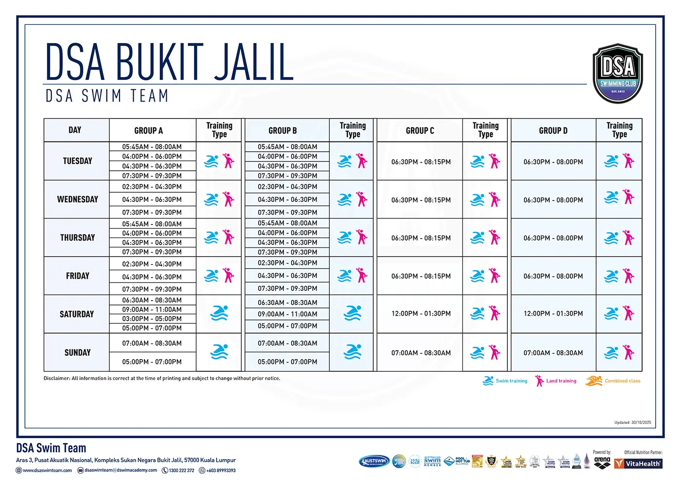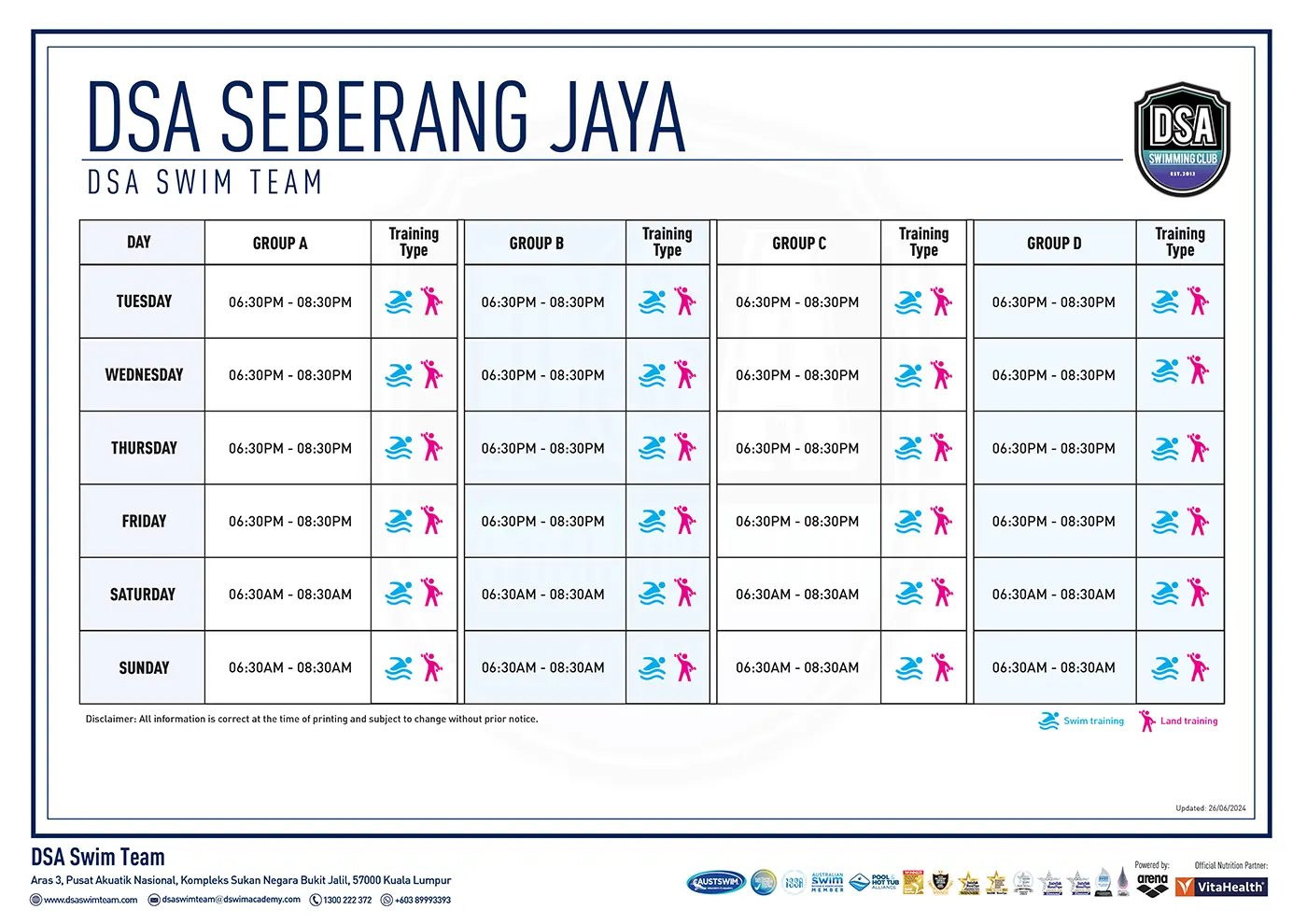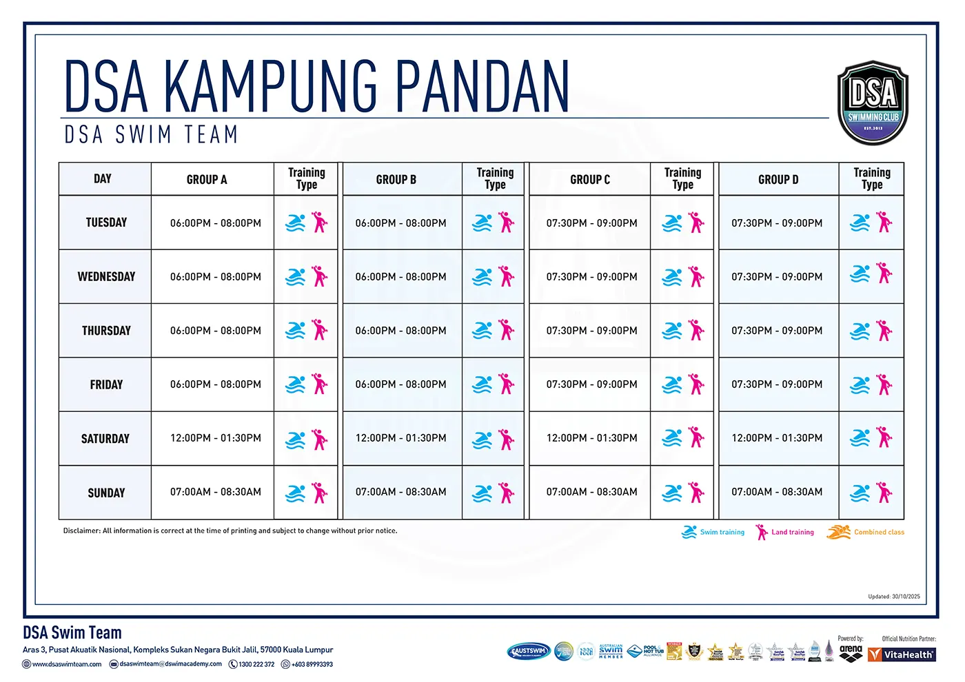 DSA TRAINING CALENDAR SQUAD TRAINING SCHEDULE BUKIT JALIL KG. PANDAN PANASONIC BUKIT UTAMA BUKIT KIARA BANDAR DATO' ONN ARENA KL SEBERANG JAYA
