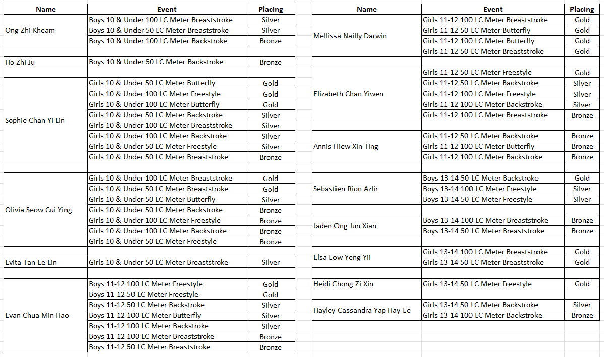 Medal winners in the older age groups included Mellissa Nailly Darwin with 4 Golds; Evan Chua Min Hao and Elsa Eow Yeng Yii with 2 Golds; Elizabeth Chan Yiwen, Sebastien Rion Azlir and Heidi Chong Zi Xin added a Gold each to the total. Annis Hiew Xin Ting, Jaden Ong Jun Xian and Hayley Cassandra Yap Hay Ee were the other medal winners who all did exceedingly well in their events. A detailed view of the medals tally is given below.